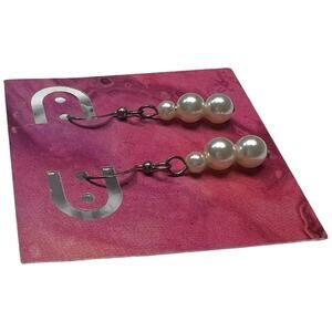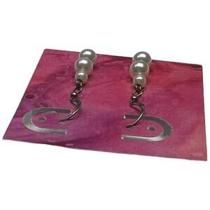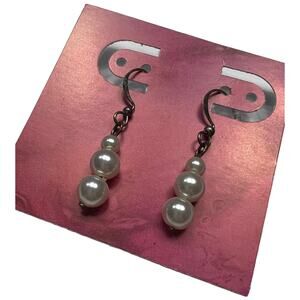 Elegantly simple, these classic pearl drop earrings feature three graduated faux pearls in a sophisticated vertical design. Each earring showcases lustrous white pearl-like beads measuring approximately 4-6mm, arranged in an ascending size pattern. The antique bronze tone hooks and findings add a vintage touch to these timeless pieces. Measuring approximately 1.25 inches in total length, these lightweight earrings provide just the right amount of movement and shine. Perfect for both special occasions and everyday wear, these versatile drops add a touch of classic grace to any outfit. The warm bronze tone hardware beautifully complements the pearl-like finish.