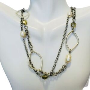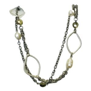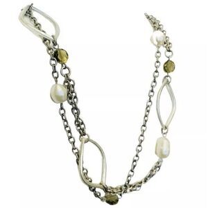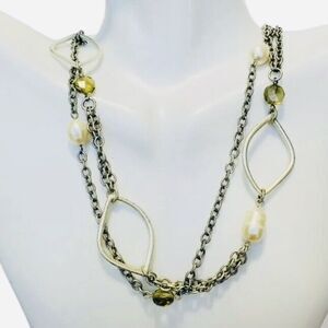 White Pearl Layered Station Necklace 18" Silver Tone Multi-Chain Station