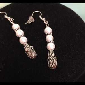 🇺🇸White Pearl & Crystal Statement Necklace & Earring!! One of a Kind Set, Handmade by Sue, adjustable 16”-20”.
