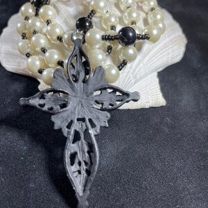 White Pearl With Black Crystal Cross, Five Decade Fashion Rosary Necklace