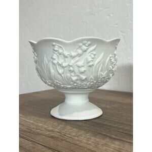 Elegant white pedestal bowl featuring raised embossed floral and botanical detailing around the exterior. This piece has a softly scalloped rim and a classic pedestal base, giving it a timeless, vintage-inspired look. The solid bottom makes it ideal as a decorative bowl or compote, perfect for displaying faux florals, decorative orbs, potpourri, seasonal décor, or as a table centerpiece.
