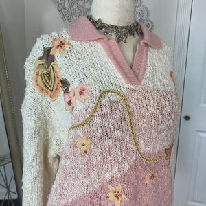 White Pink Vintage Chunky Coquette Flower Pearl Embroidered Collared Sweater M