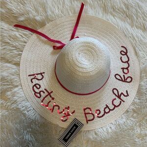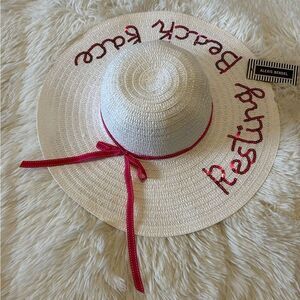 White & Pink with Pink Sequin Resting Beach Face Woven Sun beach hat NWT