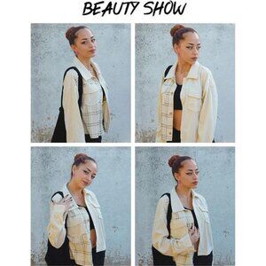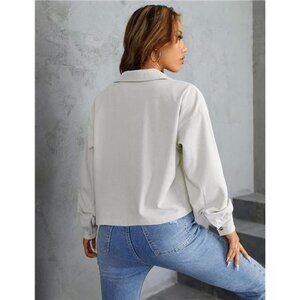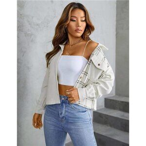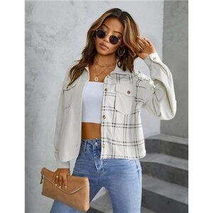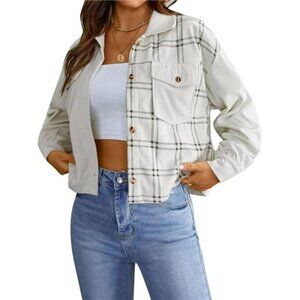 White Plaid Print Corduroy Cropped Jacket Shacket Button Down Long Sleeve Coat