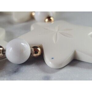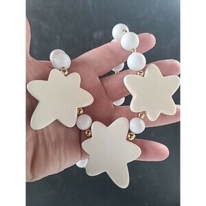 This is a vintage white plastic and gold tone metal beaded statement necklace.