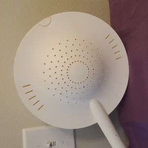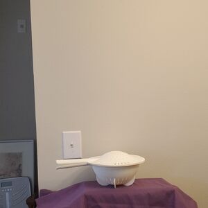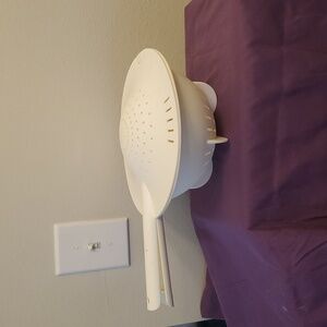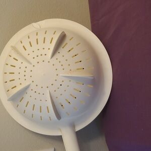 Durable white plastic colander with convenient handles. Perfect for straining pasta and vegetables.