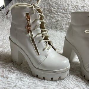 So darling, white platform booties/boots. They lace up the front. They have an aesthetic gold zipper along the front side with a rose gold cross charm. They add a few inches so look great on, but the thick heel and platform make them so easy to walk in.