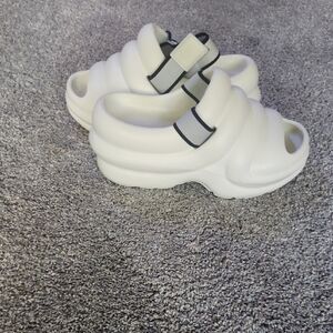 These white sandals feature a substantial platform and a cushioned sole for added comfort and height. The minimalist design is enhanced by multiple adjustable straps, offering a secure and stylish fit. Perfect for a modern, fashion-forward look.