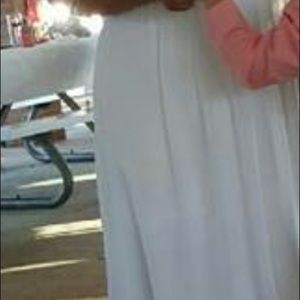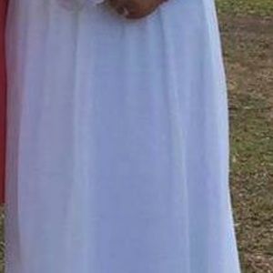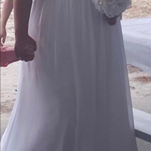 White Wedding Dress, Size 22W, halter style top, short train, simple yet very elegant. It fit me perfectly, no alterations have been done, worn once and dry cleaned. I was in a size 18W at the time and I'm 5'7" tall and wore a 2 inch heel with it.