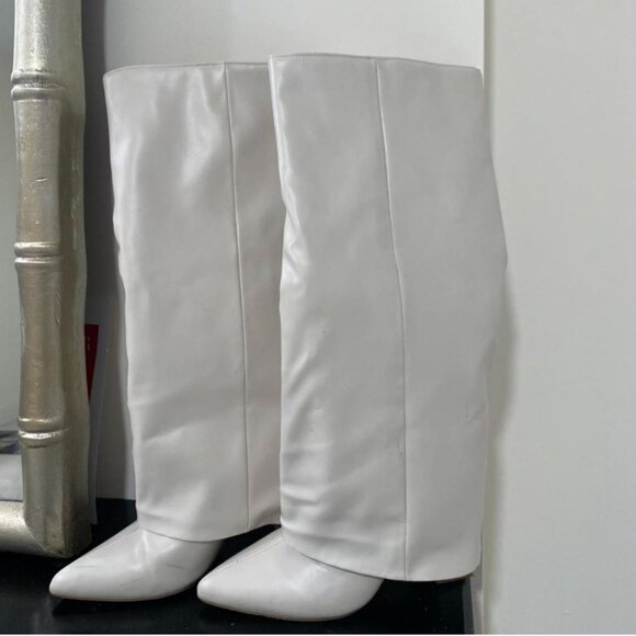 Stand out in these white pointed toe knee-high boots—perfect for going out, concerts, or adding a bold touch to any outfit. Lightly used with minor scuffs on the leather and sole, but still in great condition and full of style!