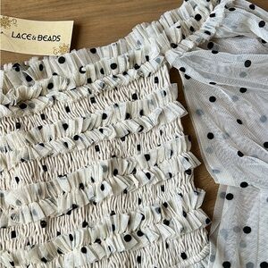 Elevate your style with this chic white polka dot off-shoulder blouse by . Perfect for any occasion, its lightweight fabric ensures comfort and elegance.