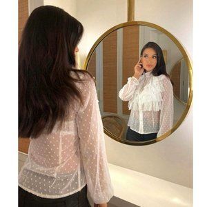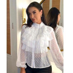 White Polka Dot Sheer Long Sleeve High Neck Ruffle Blouse Top