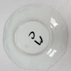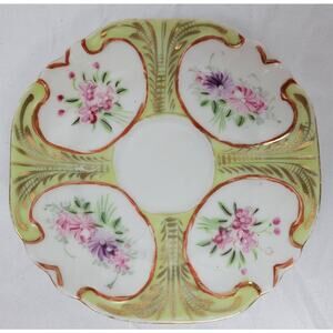 A pristine white fine china teacup. There is a symmetrical green paint in a + pattern with a white hole in the middle for where you place your teacup. Each of the 'corners' have pink/purple flowers painted with soft green leaves around them. There is also gold accenting painted. There is no mark or branding and there is no noted damage.