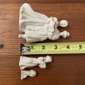 White porcelain, bisque, lighted Christmas village decorations with gold accents. The bundle includes a church, tree, dog, adult carolers and 1 child. The removable cord has been tested and found to be working but I noticed if you jiggle it the lights will turn off. You will probably want to replace the end with the short or replace the cord. I think this is a 1990s piece which originally had 8 pieces. In good pre-owned condition with some signs of wear from normal use.