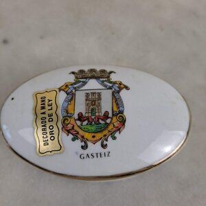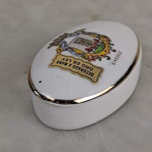 White oval shaped trinket box has a fully removable lid. The lid is rimmed in gold and is hand painted with a crest of lions, a castle and crown in the center. A sticker on the top reads "Decorado A Mano Oro De Ley". Made in Spain. A nice piece of decor for home or office that can also hold your rings or other small items.