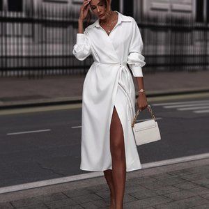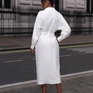 White Preppy Womens Drop Shoulder Self-tie Wrap Shirt Dress