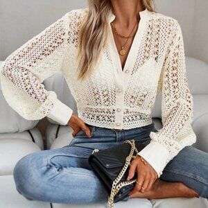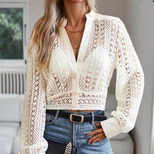 White Preppy Womens Hollow Out Button Front Crop Blouse