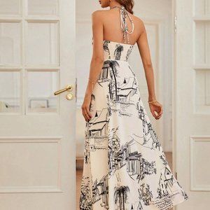 White Preppy Womens Landscape Print Tie Backless Halter Dress