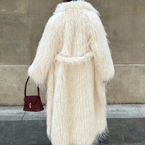 Wrap yourself in luxury with this shaggy faux fur coat, perfect for winter. The long, plus-size design ensures a comfortable fit, while the waterfall neckline adds a touch of elegance. Stay warm and stylish in this white faux fur coat.
