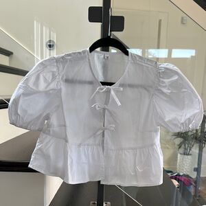 White Puff Sleeve Bow Tie/front Blouse – Size Medium like new