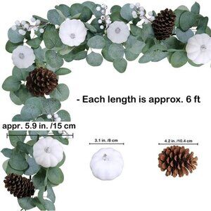 🧿Dimension: Each Faux Eucalyptus Garland measures appr. 6 feet in length and 5.9" in width. White pumpkins are in 2 sizes, 2.9" tall and 3.2" wide (large), 2.2" tall and 2.4" wide (small).