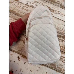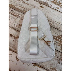 This white quilted crossbody sling bag is the season's hottest trend. 13"x9" with an athletic adjustable, detachable back strap. Interior zipper pocket and a front zipper pocket.