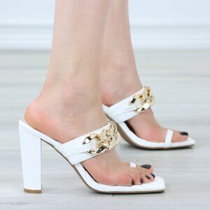 White Quilted Sandals Gold Chain Open Toe Slip-On Block Heel