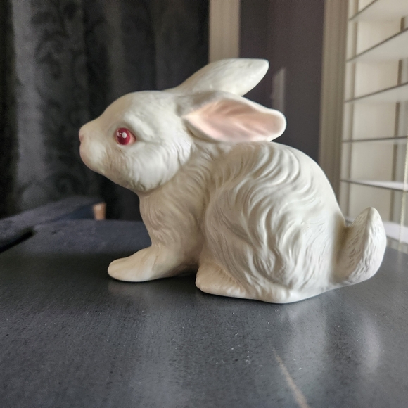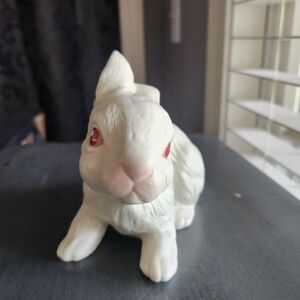 White porcelain bunny with pink eyes and pink accents in the ears. In great used condition. Super cute! approximately 6 in long and 4.5 in tall.