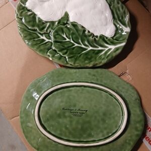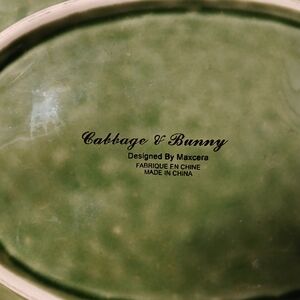 Hop into Spring with this stunning duo of Maxcera "Cabbage & Bunny" plates! These highly sought-after ceramic pieces feature a textured, high-gloss finish with a raised relief of a white bunny on a bed of green lettuce/cabbage leaves.