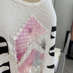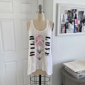 White Racer Back Knit Graphic Tank Tee With Mesh Back And Pastel Sequin Details