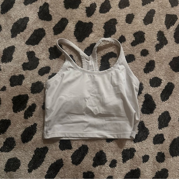 Stylish white racerback crop top. Perfect for workouts or casual wear.