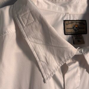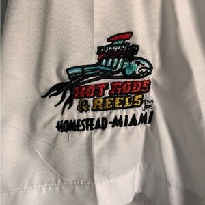 Stylish white button-up shirt with racing team logos. Perfect for motorsport enthusiasts.