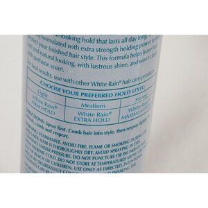 Good for early 2000's prop! White Rain Extra Hold Hair Spray. Date on can 2005. This is the 7 oz can, but it feels as though some has been used. I checked spray top, and it still works. Stands about 8 1/4 inch tall. Green plastic top. Selling for collectible value and use. Shows some wear on bottom rim of can but otherwise is overall clean and in good shape.