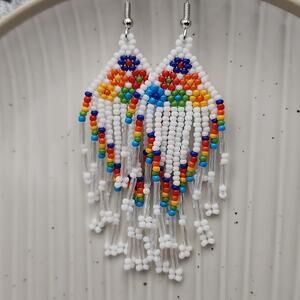 White beaded earrings with a floral pattern and dangling accents.