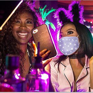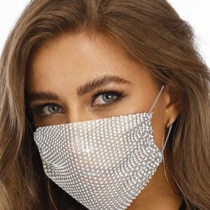 Decorative high sparkle rhinestone mesh face mask for fashion or costume. Made trendy by celebs like Paris Hilton. Can be worn alone or over a protective face mask to give it a glam touch. Perfect upgrade for any outfit.