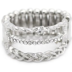 Three silver bands delicately arc across the finger in a whimsically layered display. A white rhinestone dots the uppermost band, above a row of matching white rhinestones and a braided silver band. Sold as one individual stretchy band ring. Lead and Nickel Free.