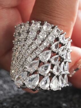 Elegant white rhodium cocktail ring with multiple rows of white lab diamonds. Features pear and round-cut stone accents for high-impact sparkle. Polished design adds instant glamour to evening and special-occasion looks.