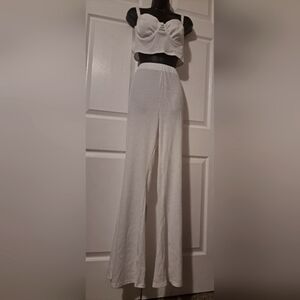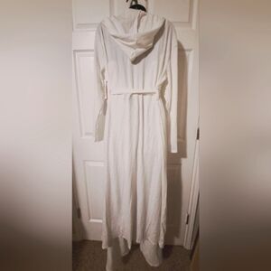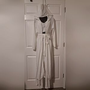 Chic White Ribbed 3 piece set by Rosevelvet! Includes pull on Pants, matching Top and Hooded Duster with waist tie. Soft, super comfortable fabric, yet luxurious 3 piece set. Dress it up or dress it down. Either way, Fabulous!