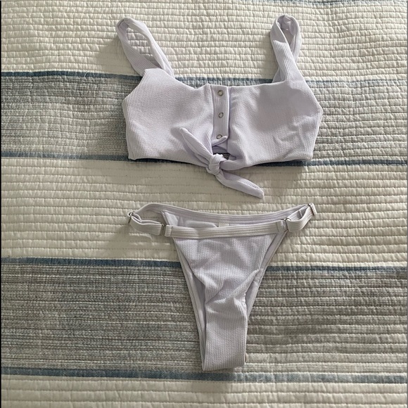White ribbed bikini with cute tie and button detail on top and sexy Itsy bottoms. Brand New w/ tags and liner sticker.