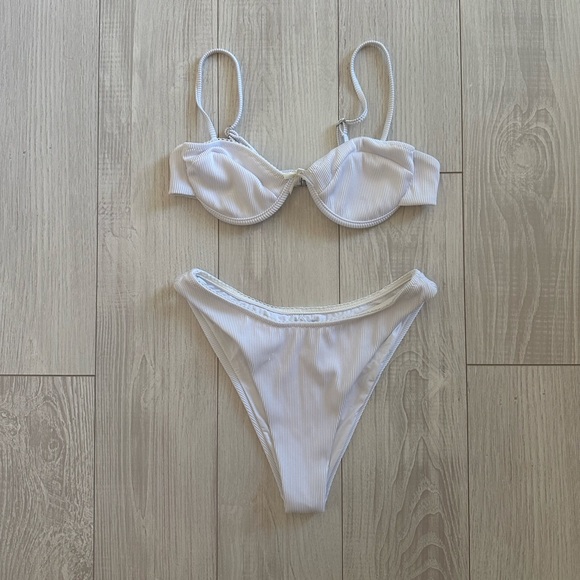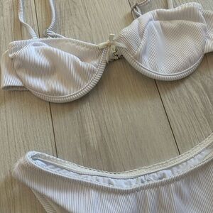 Stylish white ribbed bikini set. Includes a top with adjustable straps and matching bottoms. Only worn a couple of times. Underwire top. No padding