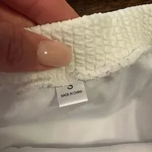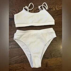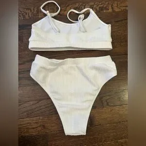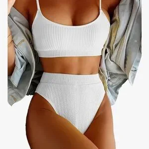 Stylish white ribbed bikini set. Features a crop top and high-waisted bottoms.