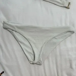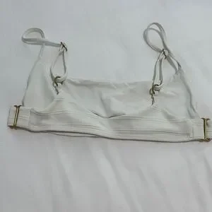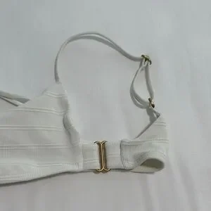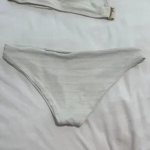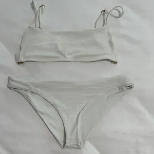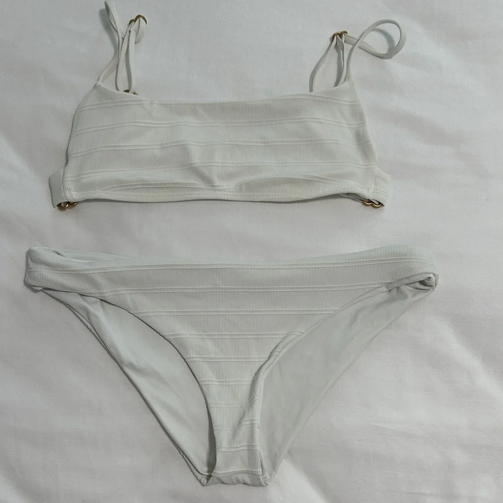 Two-piece ribbed bikini in soft white. Square neckline top with thin adjustable straps and gold accent hardware. Classic mid-rise bikini bottom. Subtle textured stripe detailing.