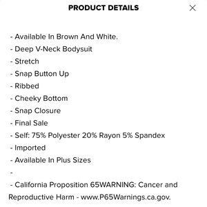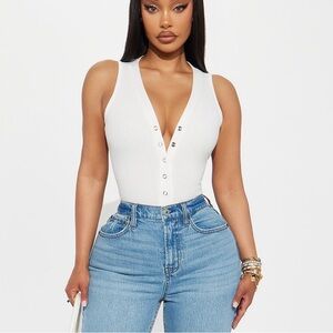 Sleek white ribbed bodysuit with button-up front. Perfect for layering or wearing alone.
