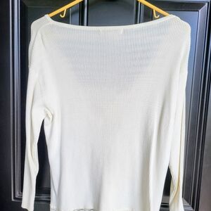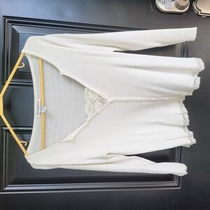 Elegant white ribbed cardigan with button-up front. Features a delicate lace trim.