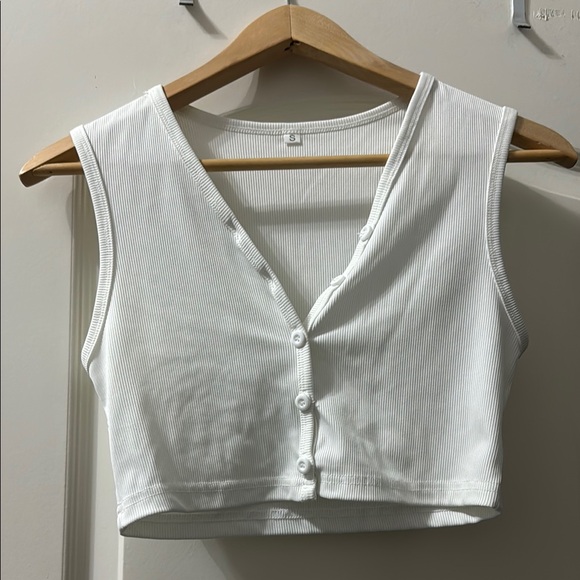 Elevate your style with this chic white ribbed button-up crop top. Perfect for any casual outing.