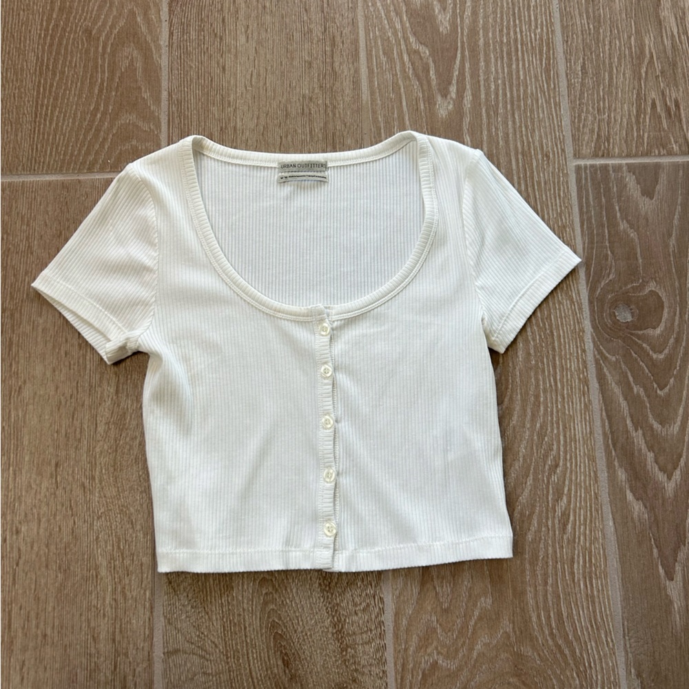 Elevate your style with this chic white ribbed crop top. Featuring a button-up front, it's perfect for casual outings or layering. A versatile addition to any wardrobe.