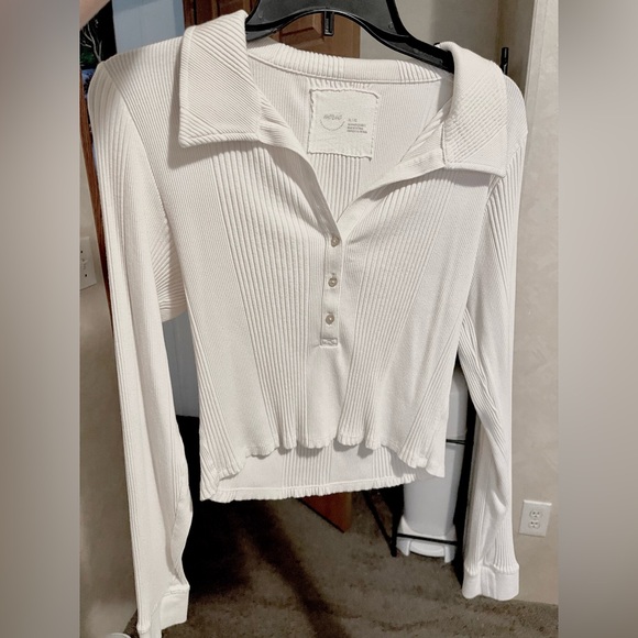 Elevate your wardrobe with this chic white ribbed button-up top. Perfect for any occasion, this stylish piece offers both comfort and elegance.
