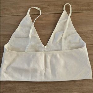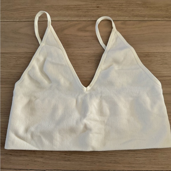Stylish ribbed crop top. Features a deep V-neck. Perfect for layering.