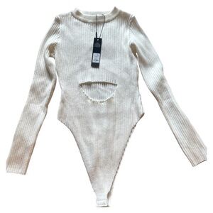 Stylish white ribbed bodysuit with a bold cutout design. Perfect for a chic look.