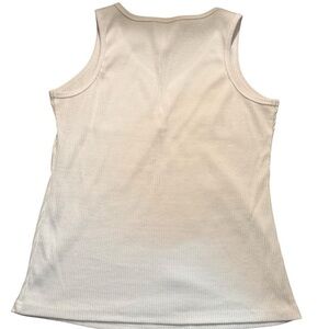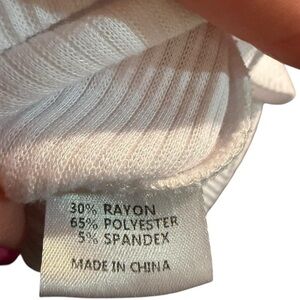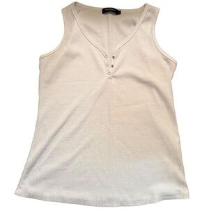 Soft and stretchy white ribbed tank top with a flattering V-neckline and button detail. Lightweight and comfortable with a fitted silhouette. Fabric blend: 65% polyester, 30% rayon, 5% spandex. Approx. 24” length, 16” bust flat.